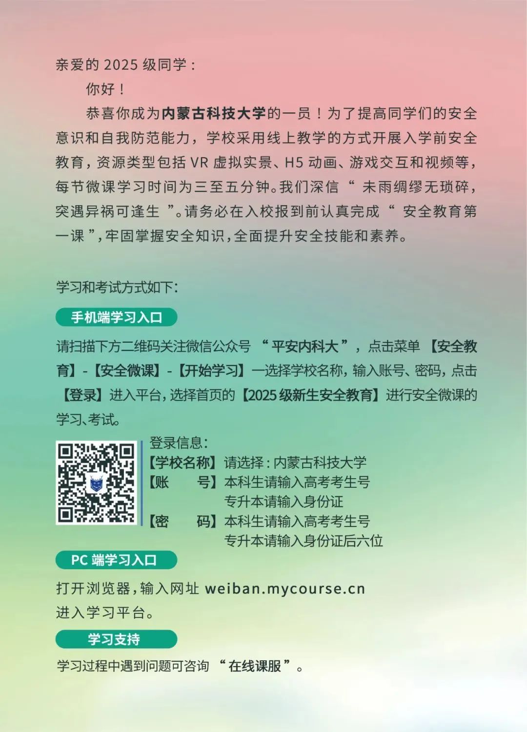 2025级新生安全教育微课已正式开课,请同学们按照学习通知书中的学习流程,选择登录方式进行学习和测试。祝愿每位同学的大学生活平安、健康。