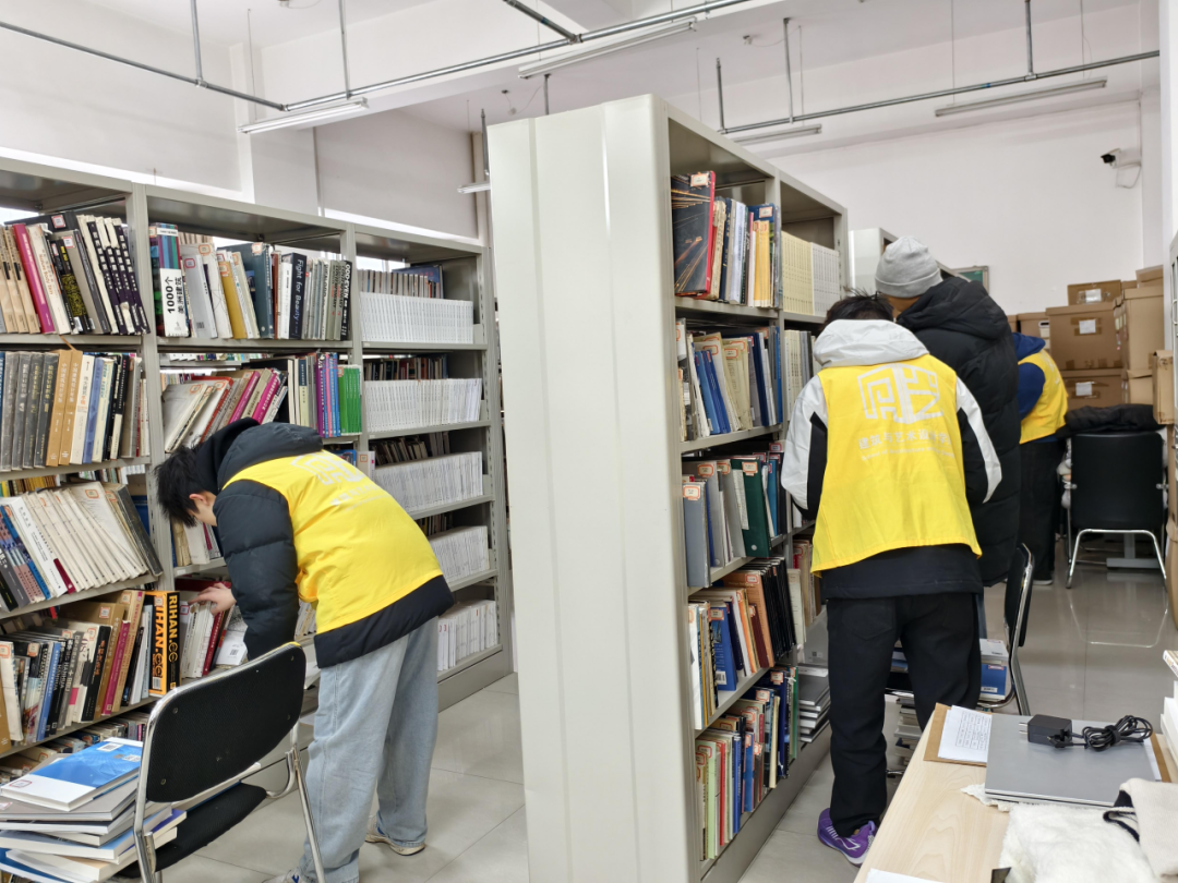 资料室。志愿者们热情饱满、分工协作,干劲十足:有的细致核对图书编号,精准分拣专业教材、设计期刊、学术专著等各类资料,确保分类规整无遗漏;有的轻拿轻放搬运书籍,细心呵护每一本图书,杜绝折损情况;有的在新资料室科学规划书架布局,有序完成图书上架陈列。