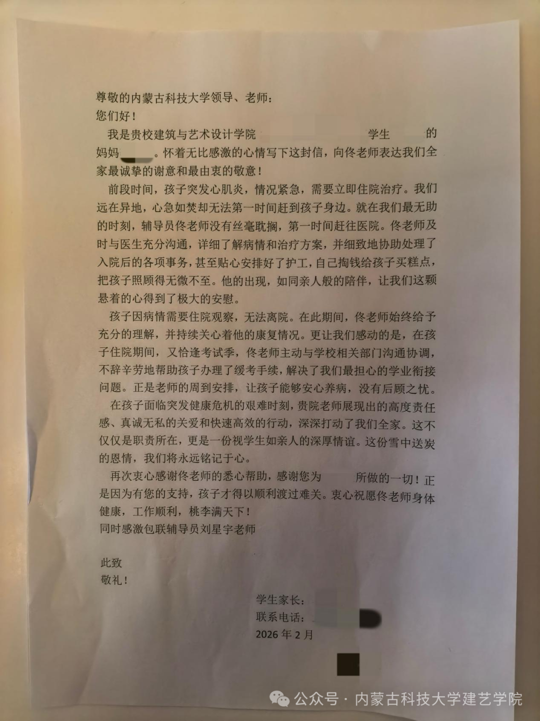 收到了学生家长的一面锦旗和一封感谢信,对班主任佟天扬老师及a片好色学工办、教学办等各部门的老师在上学期对患病学生的悉心照料与无私帮助表达了由衷的感谢和莫大的肯定。